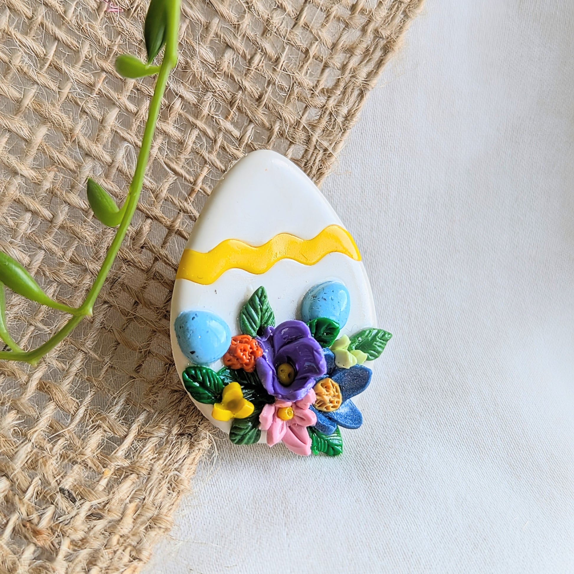 Delicate egg-shaped pin with spring flowers and robin's eggs. Perfect for the easter season.