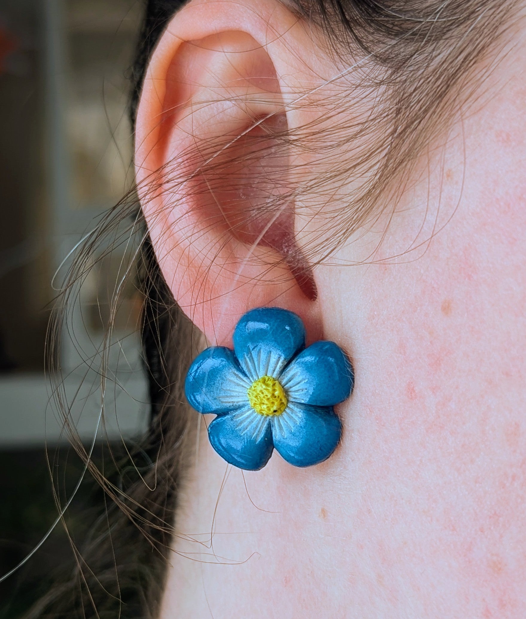 Handmade and hand-painted polymer clay forget-me-not flower stud earrings.